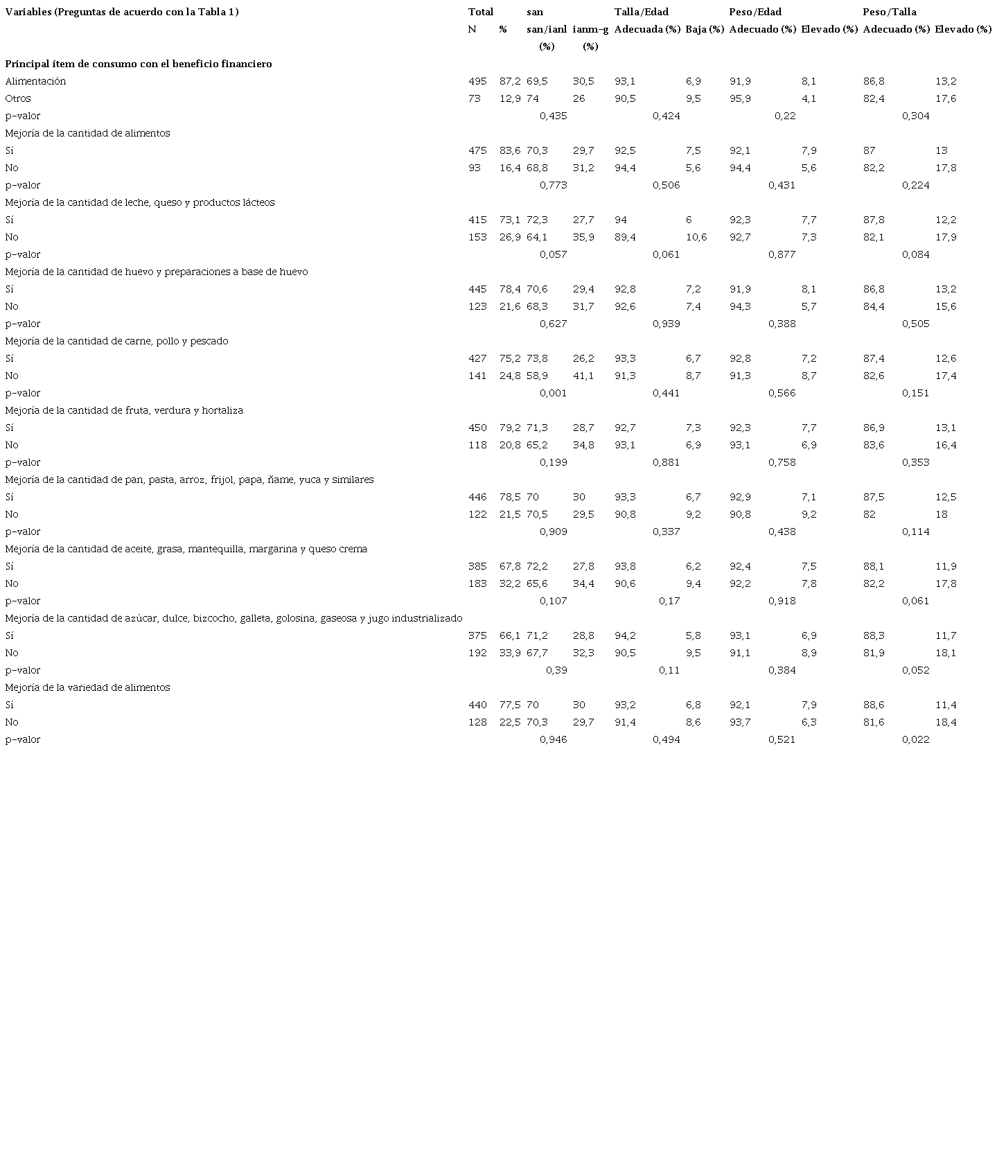 De las 586 madres, 18 indicaron que no habían recibido las transferencias financieras del pbf en los últimos tres meses. Cuando se les preguntó por las repercusiones del pbf en la alimentación de la familia, la indicación de la alimentación como principal rubro de consumo adquirido con los recursos económicos del programa se señaló por 87,2 % de las 568 respondientes. La mejora en la cantidad de alimentos y en la variedad de la alimentación fue respondida por 83,6 y 77,5 % de los casos, respectivamente. En cuanto a la mejora en la cantidad de los diferentes ítems alimentarios de interés, se destacó que azúcar, dulce, bizcocho, galleta, golosina, gaseosa y jugo industrializado fue el de menor proporción de respuestas positivas (66,1 %). Fruta, verdura y hortaliza fue el ítem que tuvo el mayor número de respuestas afirmativas (79,2 %). La mejora en la cantidad de carne, pollo y pescado representó situación de san superior. En cuanto al efecto positivo del programa en la variedad de la alimentación, se relacionó al p/t adecuado (véase Tabla 3].