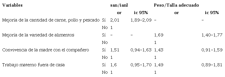 La Tabla 4 muestra los valores de odds ratio (or) y los respectivos ic 95 % para las variables de los modelos finales de asociación con la san/ianl y con el p/t adecuado. La mejoría de la cantidad de carne, pollo y pescado presentó or para san/ianl igual a 2,01 veces (ic 95 %: 1,89-2,09), al compararla con la situación contraria. A su vez, la mejoría de la variedad de alimentos presentó or para p/t adecuado igual a 1,69 veces (ic 95 %: 1,40-1,77), al ser comparada con la de las familias en las cuales la variedad de alimentos no mejoró.