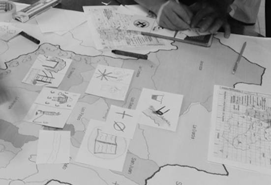 Introducción a la cartografía socioambiental. Se hicieron ejercicios de definición colectiva de conceptos básicos, como también se llevó a cabo la construcción participativa de la metodología cartográfica y la selección de símbolos a utilizar posteriormente en la elaboración de mapas, representativos de los fenómenos, de las situaciones y de las actividades que se plasmarían en ellos.