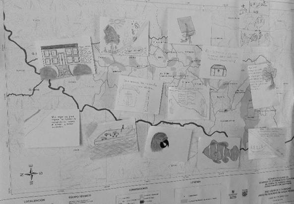 Elaboración de mapas socioambientales. La consigna para el levantamiento de estos mapas estuvo relacionada con plasmar los cambios y las transformaciones del territorio a partir de la actividad económica de la minería en tres temporalidades: pasado, presente y futuro. Estos mapas fueron socializados y discutidos, y hubo grabaciones de estas conversaciones, las cuales fueron transcritas para el análisis posterior. Las imágenes que se presentan en este artículo ilustran las construcciones de los participantes, cuidando la confidencialidad que corresponde [Figura 1].