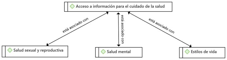 En el análisis emergió un sistema de categorías, integrado por una categoría nuclear denominada “Acceso a información para el cuidado de la salud”, que vincula los conocimientos y las prácticas en salud sexual y reproductiva, salud mental y estilos de vida, las cuales tuvieron la máxima saturación teórica (véase Figura 1].