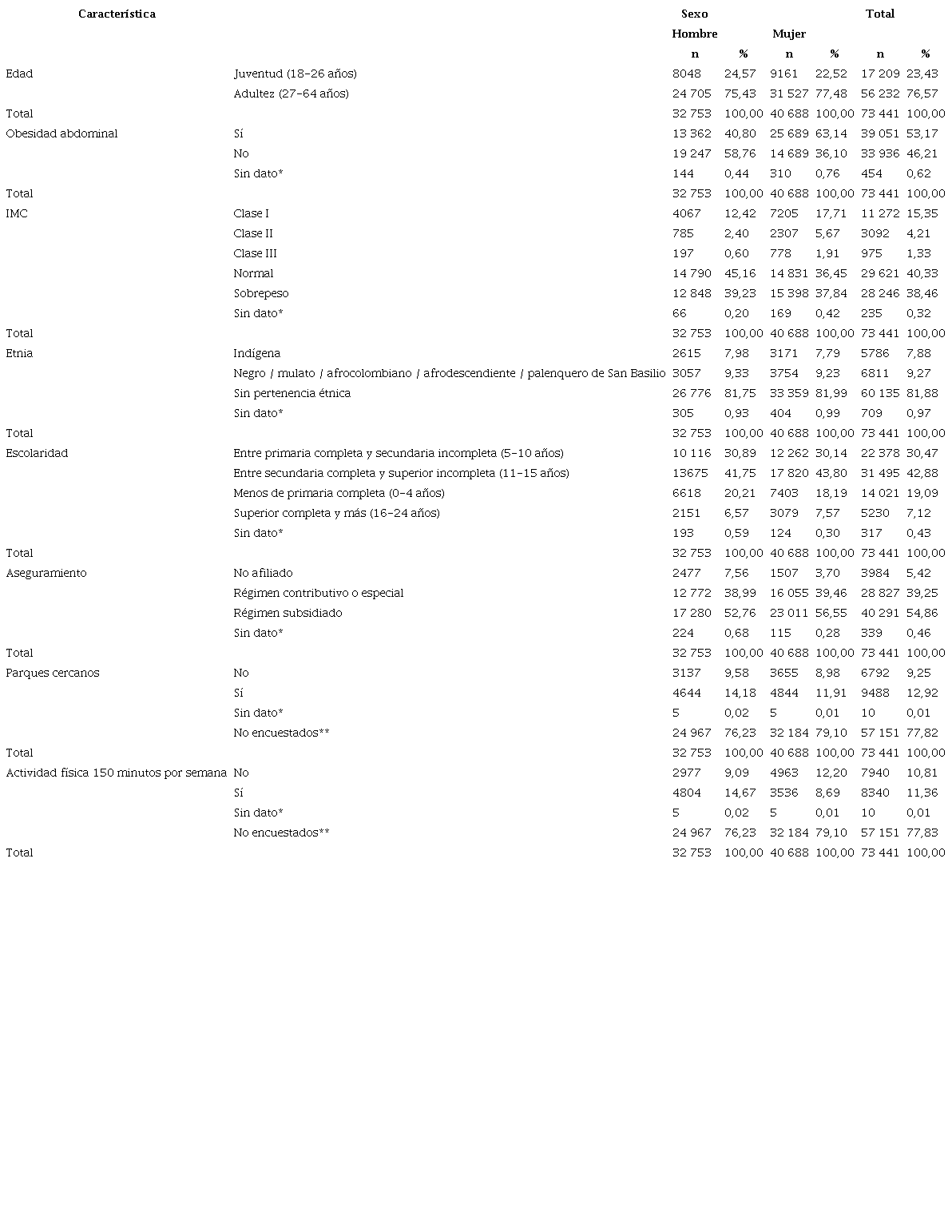 Los datos son tomados de las bases de datos de antropometría y de actividad física (submuestra de la ENSIN) de los adultos de 18 a 64 años y de los estándares de la OMS para clasificar el sobrepeso y la obesidad en kg / m2 según el índice de masa corporal (imc) [30], donde el rango normal es 18,50-24,99; sobrepeso: 25,00-29,99; obesidad clase i: 30,00-34,99; obesidad clase ii: 35,00-39,99; obesidad clase iii ≥ 40,00. También se utiliza el trabajo de Ko y Tang [31] para clasificar la obesidad abdominal en hombres y mujeres con la circunferencia de cintura en cm, donde la obesidad abdominal ≥ 90 cm en hombres y ≥ 80 cm en mujeres, con ambas referencias para la edad de estudio.