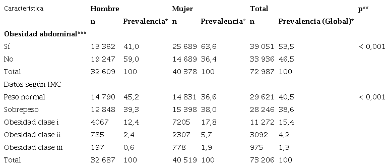 En la Tabla 2, se muestra que las condiciones estudiadas fueron significativas (< 0,001); la prevalencia del sobrepeso es el 38,6 (28 246 / 73 206) por cada 100 habitantes, y en la obesidad abdominal prevalece el 53,5 (39 051 / 72 987) por cada 100 habitantes. Las mujeres prevalecen 22,6 puntos por encima de la obesidad en los hombres.