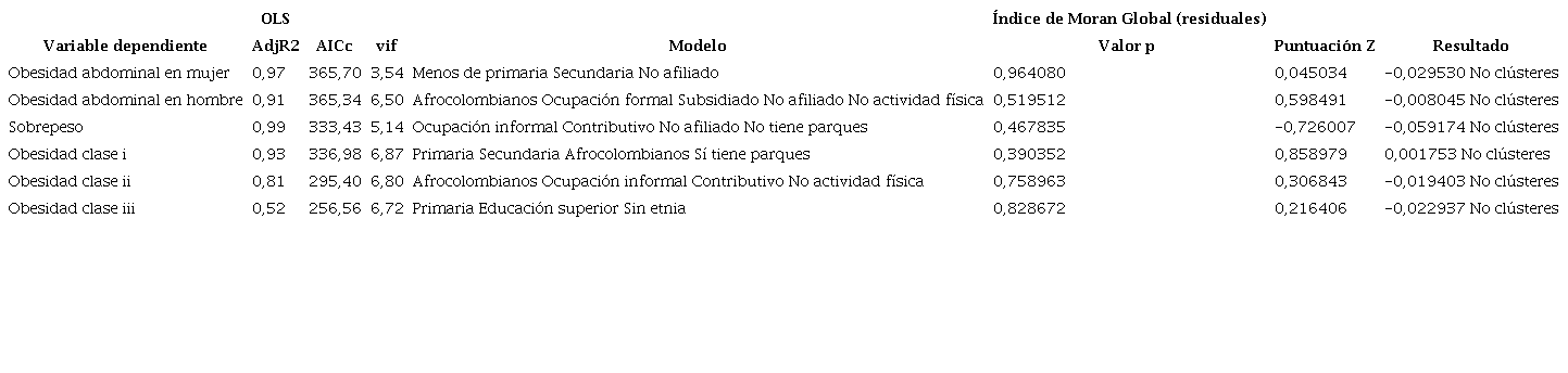 En cuanto al valor p, los modelos difieren entre la obesidad abdominal y la obesidad clase ii y clase iii; sin embargo, para el sobrepeso y la obesidad clase i es significativo con valor p< 0,05; sin embargo, el sobrepeso es de -0,72, es decir, autocorrelación negativa, donde su localización espacial es disímil entre sus vecinos.