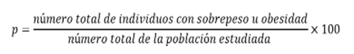 Se lleva a cabo recategorizando la variable de circunferencia y el imc en el software Statistical Package for Social Sciences de International Business Machine (IBM® SPSS®) versión 25, con licencia de la Universidad de Antioquia. Para el análisis descriptivo se calcula la prevalencia de sobrepeso y la obesidad de cada departamento y se elaboran los gráficos. La fórmula es la siguiente [32]: fórmula (1)