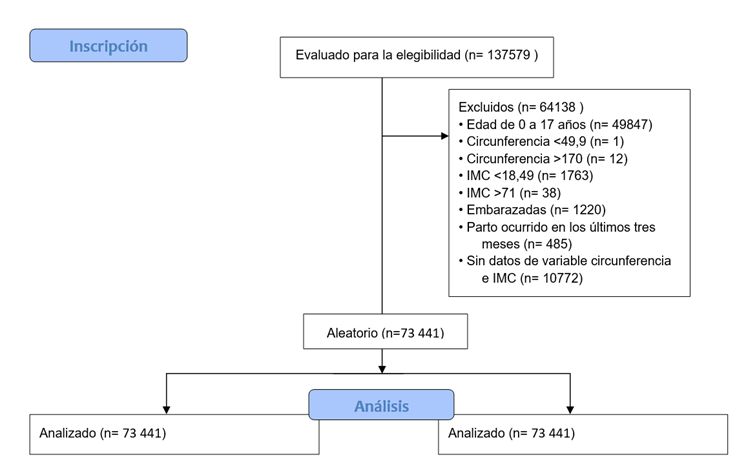 En la base de datos de la ENSIN de antropometría se encuentran 137 579 personas encuestadas, de los cuales 73 441 tienen de 18 a 64 años y no están en embarazo o posparto. Para llegar a ello, se realiza un proceso de limpieza de los datos, antes de extraer las variables de interés, eliminando datos atípicos dentro del comportamiento natural de cada variable. En la Figura 1 se describe el detalle de la depuración y, por último, se extraen solo las variables de interés y se unen con las variables de interés de la base de datos de actividad física.