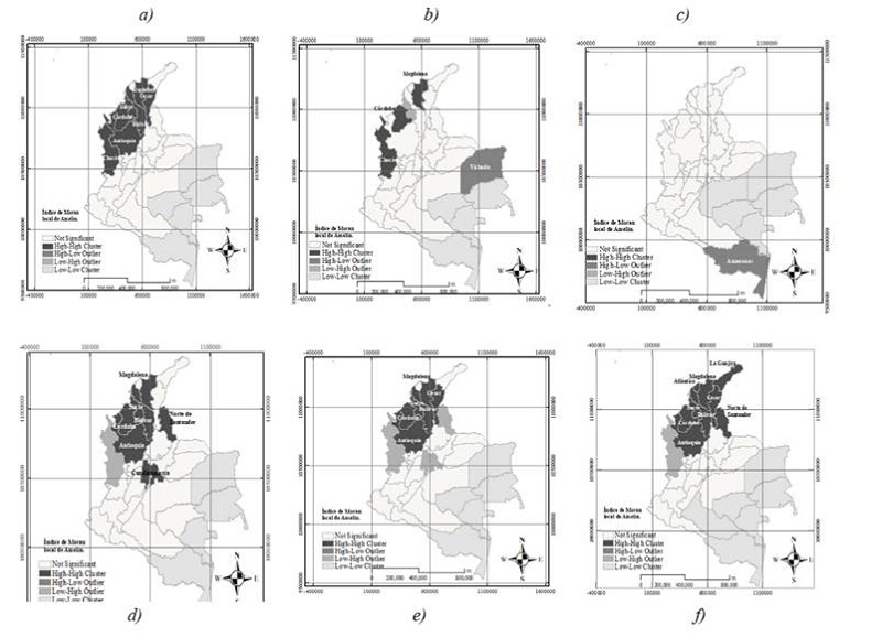 Por lo anterior, los valores del I’Moran Global oscilan entre 0,8 y −0,7 en las seis variables dependientes del estudio, aceptando la hipótesis nula, es decir, la configuración espacial es aleatoria.