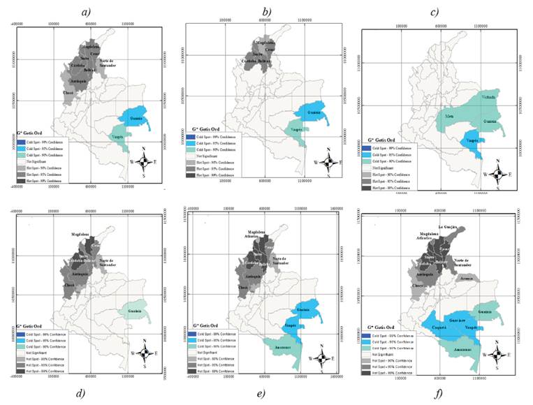 En un análisis geoespacial usando herramientas sig son muy importantes el índice de Moran Global (I’Moran Global), porque este mide la asociación global del territorio; el índice de Moran Local de Anselin, que también es conocido como el índice local de autocorrelación espacial (Local Indicators of Spatial Association, lisa), muy utilizado para observar la dependencia espacial en la ocurrencia de la enfermedad y su áreas de agrupación espacial (clustering), y el G* Getis Ord, para la identificación de los conglomerados a nivel espacial que tiene la enfermedad, y sobre la base de autocorrelación espacial se usan los residuales de los mínimos cuadrados ordinarios (Ordinary Least Squares, OLS) o la regresión ponderada geográficamente. En el apartado “Discusión” se mencionan algunos análisis espaciales realizados en países latinoamericanos y sus resultados [12,27-29].