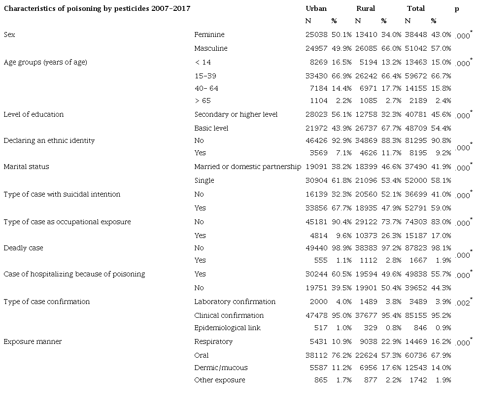 Between January 2007 and December 2017, 89 490 ca ses were reported to the SIVIGILA. A list of sociodemo graphic characteristics of the reported cases is presented in Table 1. A higher proportion of poisonings among men living in rural areas compared to those who lived in urban areas (66% vs. 49,9%: p < 0,001) was observed.