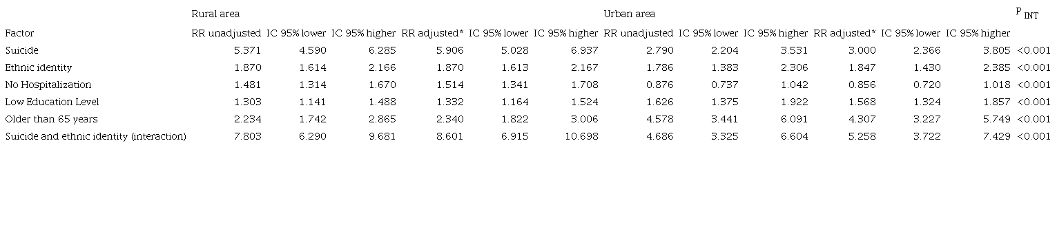 Cases of suicidal intention for people living in rural areas who reported ethnic belonging showed a greater RR: 8,6 (95% CI 6,9-10,6) compared to the same popu lation in the urban areas, RR: 5,2 (95% CI % 3,7-7,4) (pint < 0,001) [Table 2].
