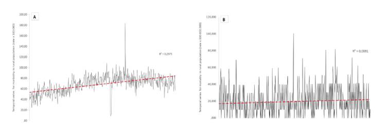 In addition, an upward mortality and morbidity trend was found in the time periods in rural areas (R2 =0,65 and 0,16, respectively) [Figure 1B). Finally, there was a notable difference in the behavior of the mortality rate according to the place of occurrence of the event. The PAR was 69,6% (95% CI 54,2-89,3%). Additionally, an increasing trend of this indicator was observed throughout the time period (R2=0,2498) [Figure 1C).