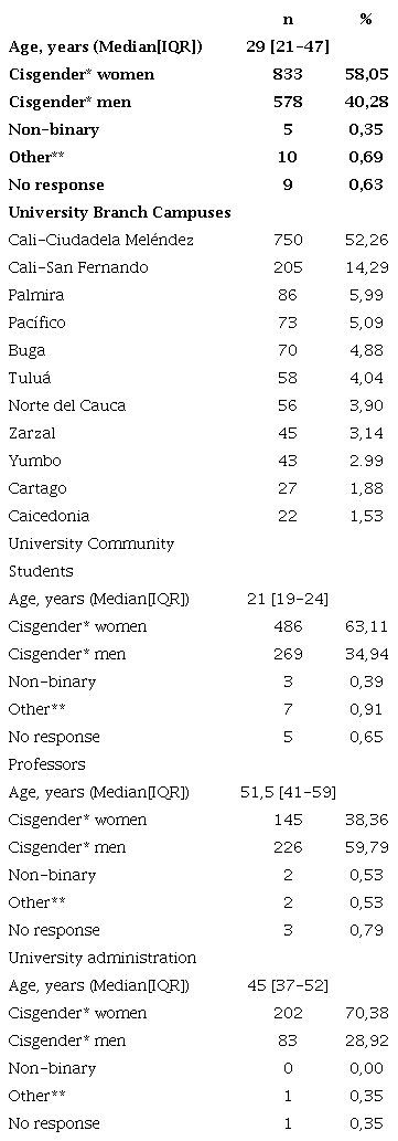 The total number of participants was 1435, with 378 belonging to the Professors group, 770 students, and 287 to the university staff. The median age was 29 years [21-47] (see Table 1]. In addition, cisgender women had the highest participation in the survey, with 58,05%. The university branch campuses that participated the most were in Cali (Meléndez and San Fernando).