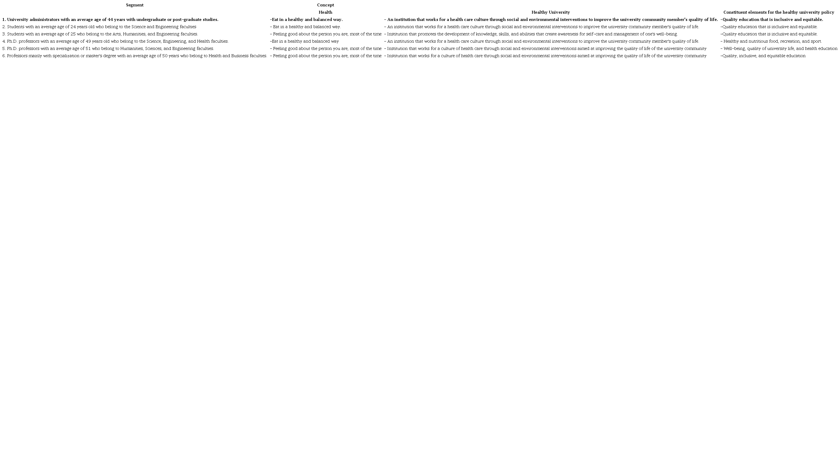 Methodology: An exploratory cross-sectional study was conducted at Universidad del Valle, a public university located in Cali, Valle del Cauca, in the Southwest of Colombia. In March and May 2021, the survey "Concepts of health, Health Promoting University and constituent elements for the formulation of an institutional policy of Healthy University" was applied. The target population was the university community, involving professors, students, and university administration. For the data analysis, the technique of segmentation by two-stage cluster and the study of main components were used.