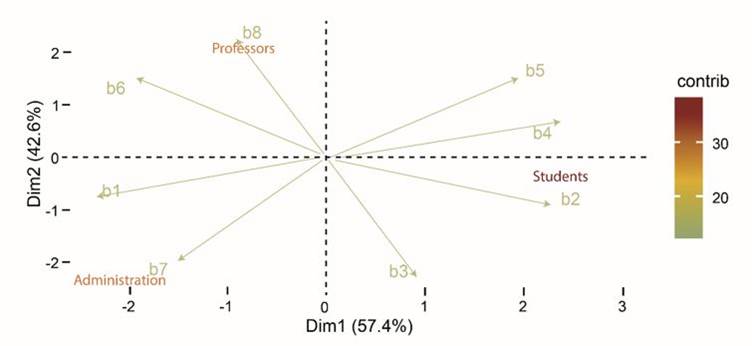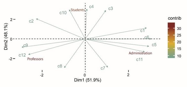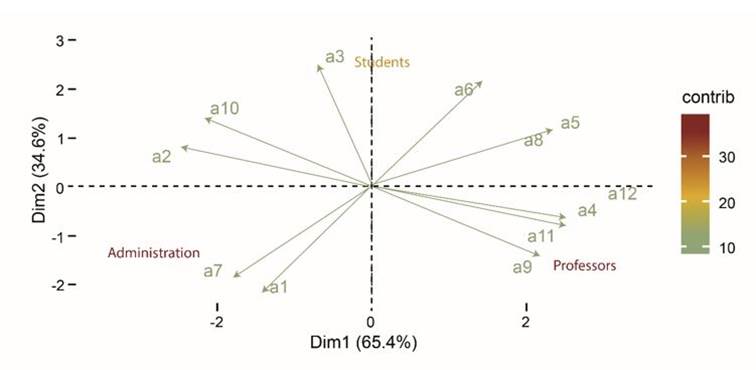 An analysis of the main components was led to identify the perception of the university community at its various hierarchies regarding the concepts evaluated through the survey [7]. The variables analyzed with this technique were the responses received by the participants concerning the concept of health, the responses received by each university community group about the concept of a Healthy University, and the responses received about the constituent elements for Health Promoting University Institutional policy. This analysis allows the visual representation of the relationships between the variables that are describing the participants based on the decrease in the dimensionality of the problem.