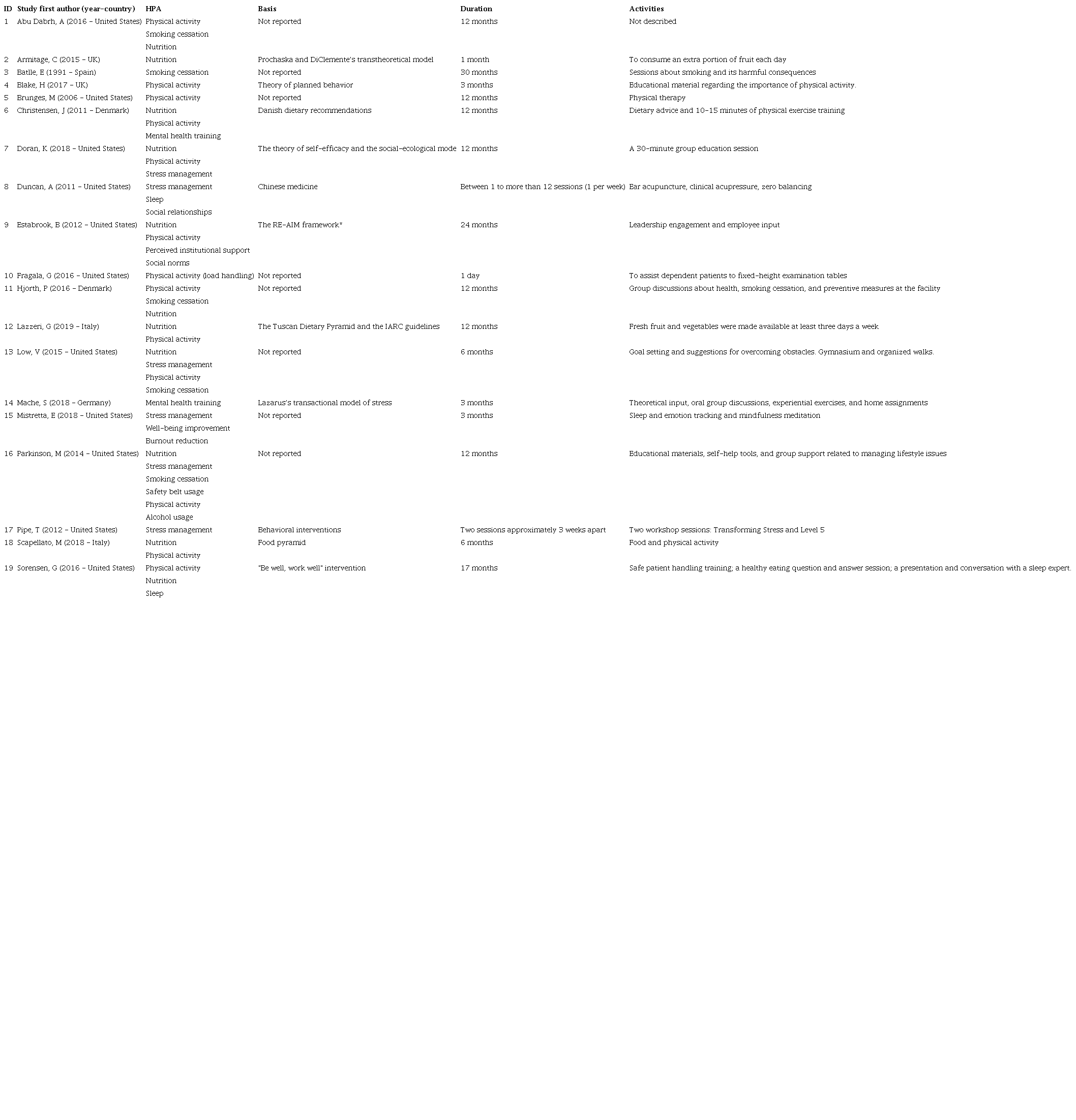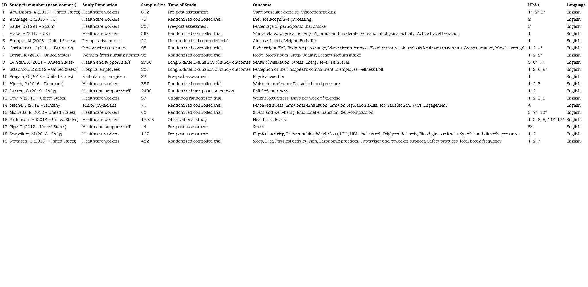 Conclusions: WHPAs can enhance physical and mental health, and overall well-being, and encouraging healthier behaviors among health personnel. Most of the studies targeting mental health focused their efforts primarily on reducing healthcare workers’ perceived stress. WHPAs that addressed both diet and physical activity behaviors were more effective at improving weight outcomes than those that used only one approximation. Overall, this study offers valuable information on the impact of worksite-based health promotion interventions, including the effect of different strategies applied.