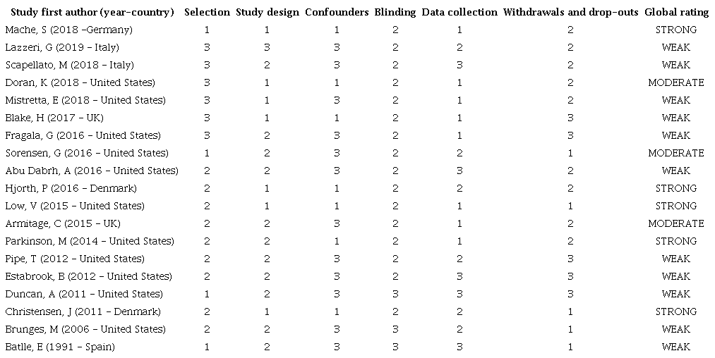 All the papers included were independently read and evaluated by both authors. Any discrepancy was resolved in a consensus meeting. Based on the Quality Assessment Tool for Quantitative Studies Effective Public Health Practice Project criteria, eleven articles were categorized as “weak” in methodological terms, three as “moderate,” and five as “strong” (see Table 4].