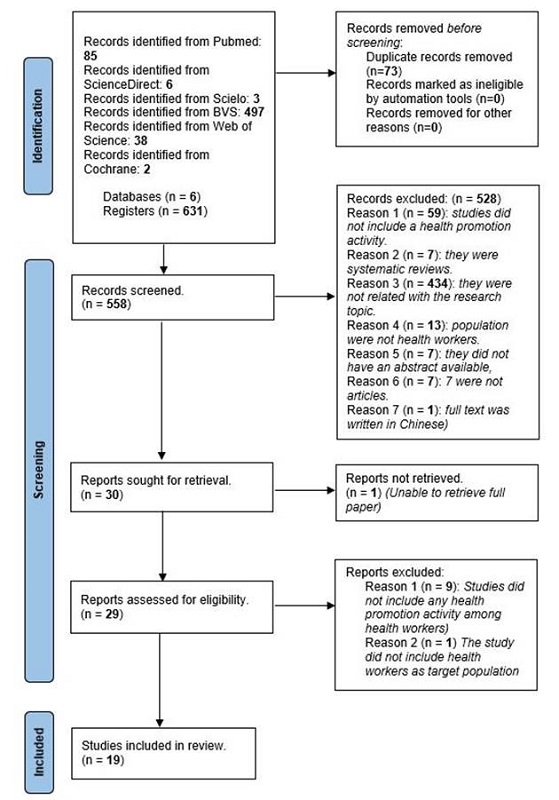 Figure 1 shows the flowchart of the literature search. In total, 558 potential studies were identified after removing the duplicates. Then, 528 titles were excluded for the following reasons: 434 were not related to the research topic; 59 did not include a health promotion activity; 13 were not implemented among health workers; 7 did not have an abstract available; 7 were systematic reviews; 7 were not articles; and 1 the full text was written in Chinese. Then, we did not grant access to one out of the 30 included papers; therefore, 29 articles were included for a full revision. After reading the full papers, 9 studies were removed because they did not incorporate any health promotion activity among health workers, and 1 did not include health workers as the target population. Thus, the final sample consisted of 19 papers that were included for methodological quality assessment.