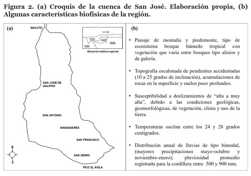 La comunidad de San José está localizada en el Parque Nacional Waraira Repano, al noreste del casco central de Caracas, en la parroquia Macuto del estado Vargas, cercana a los centros poblados de San Antonio, Manzanares, San Francisco y San Isidro, que conforman Galipán (Figura 2). San José se encuentra entre las cotas 700 y los 1200 m.s.m, enlazándose mediante carretera de montaña por una única vía que conecta Punta de Mulatos en el litoral central (Macuto) con Cotiza en el Municipio Libertador del Distrito Capital. Está emplazada al sur de la Cuenca del río San José que pertenece al sistema de la Cordillera de la Costa en su vertiente norte. Posee una red de drenaje en la cual destacan las quebradas Fonduco, Mineral, La Concepción y Los Perros (Ávila López y Martínez Castillo 2007; IERU, FUNINDES-USB 2002), algunas de las cuales sirven como fuentes de abastecimiento de agua, para consumo doméstico y riego, a través de un sistema precario de distribución por mangueras.