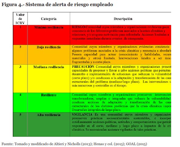 El valor global obtenido por el índice de resiliencia comunitaria, se interpretó siguiendo el sistema de alerta presentado en la Figura 4.