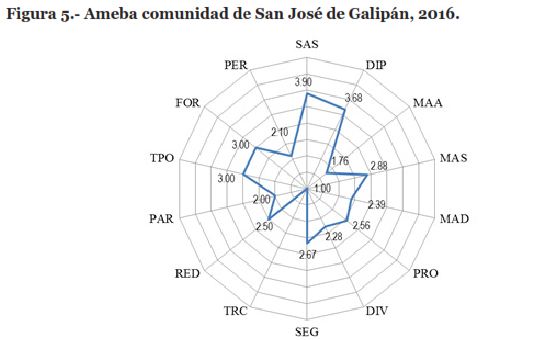 Algunos elementos a considerar para comprender estos resultados se muestran en el gráfico tipo “Ameba” (Figura 5), donde se evidencian que las variables económicas (indicadores PRO, DIV, SEG, TRC), políticas (indicadores RED, PAR, TPO, FOR) y psicosociales (PER) afectan más la resiliencia de la comunidad que las ambientales (MAS, MAA, MAD), aunque estas son especialmente precarias en cuanto al manejo que la comunidad hace del ecosistema.