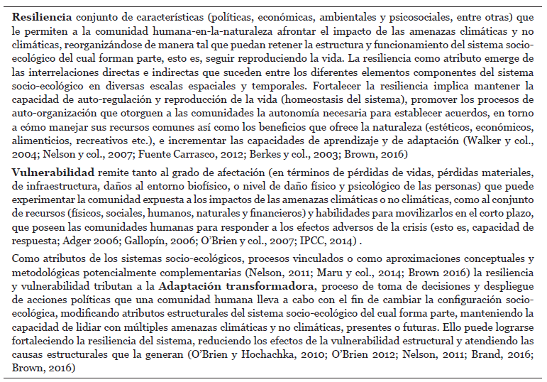 Los discursos acerca de la Vulnerabilidad, Resiliencia y Adaptación en torno a la crisis climática fueron consolidándose de manera independiente a través del tiempo, nutridos por diferentes orígenes disciplinares, métodos, objetos de estudios y contextos de análisis (Gallopin, 2006; Adger, 2006; Janssen, 2007; Nelson, 2011; O´Brien y col., 2007; Turner II, 2010). No obstante converger en la actualidad en una narrativa común y dominante acerca del cambio climático (IPCC, 2014) no existen definiciones unívocas o acabadas. Partiendo de consideraciones críticas, se emplea en este trabajo la noción de crisis climática (Seaone y col., 2013) y se utiliza una relectura propia de nociones claves en el discurso dominante (Tabla 1) con el fin de generar un marco conceptual congruente.