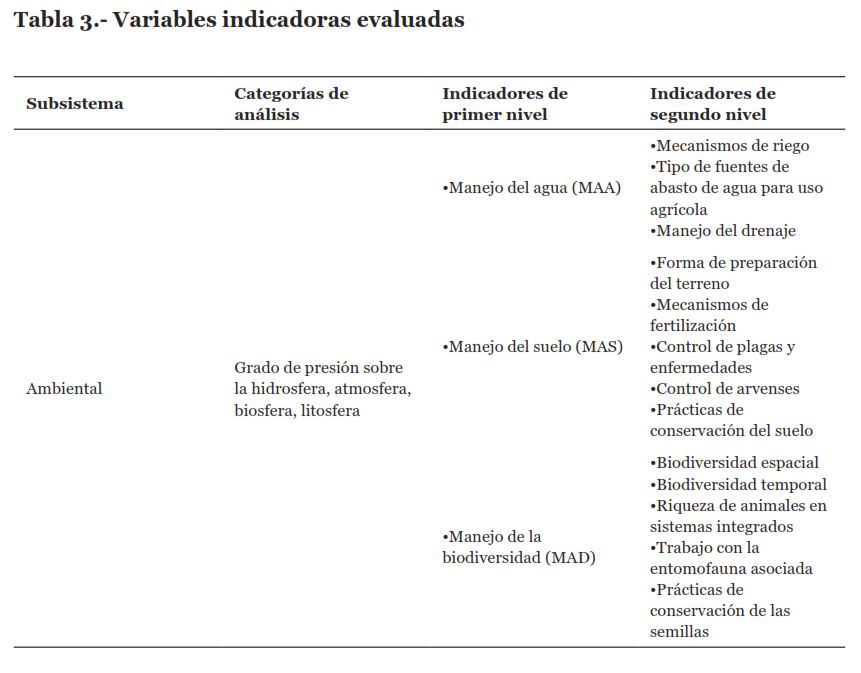 Se emplea una perspectiva antropocéntrica, usando categorías de análisis generales que tratan las dimensiones ecológicas y sociales con un mismo nivel de profundidad, cuya caracterización más detallada (mediante el uso de variables anidadas de primer y segundo nivel por ejemplo) debería ser elaborada por los mismos sujetos sociales interesados en llevar adelante acciones transformadoras. En el caso de este trabajo dichas variables se presentan en la Tabla 3.