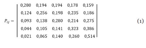 Analisando a primeira linha da matriz (1), temos que 0,280 é a probabilidade dos municípios que estavam no grupo 1 em 2000 permanecerem com as mesmas taxas em 2010, portanto não alterando de grupo. A chance desses municípios do grupo 1 migrarem para os grupos 2 ou 3 após dado período de tempo é de 0,194. Verificasse uma redução nas probabilidades dos participantes do grupo 1 mudar para o grupo 4 (0,178 de probabilidade) ou para o grupo 5 (0,159 de probabilidade) após o período de dez anos. Da primeira linha pode-se concluir que a maioria das localidades com taxas de homicídios entre 1,03 e 7,02 (grupo 1) tem forte tendência a permanecer com a taxa constante, sofrendo uma redução nas chances de se ter maiores taxas. Já que verificasse a maior probabilidade encontrada é 0,280.