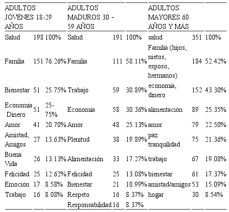 El núcleo figurativo en este grupo esta constituido, por “salud”, “familia”, “trabajo”, “economía”, “amor” y “bienestar”. Aquí se resalta que, aunque son los mismos elementos que para los jóvenes, el orden de importancia se modifica, siendo el trabajo y la economía más importantes que el amor. Se observa que existen entre esta población madura, conceptos específicos como “plenitud”, “respeto” y “responsabilidad”, que no aparecen en los otros grupos, lo cual estaría de acuerdo con lo propuesto por Erikson, quien indica que se trata de una etapa dedicada al cuidado y educación de las generaciones jóvenes. cuyas características principales son la procreación, la productividad y la creación.