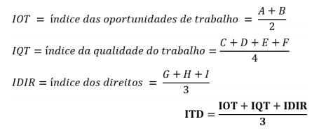 Então foi possível calcular um número índice para cada componente do trabalho decente, como média aritmética das variáveis normalizadas e, sucessivamente, os índices parciais foram usados no cálculo do ITD. A escolha de atribuir um peso igual a cada variável reflete a opinião que todas as variáveis escolhidas são igualmente relevantes para delinear a qualidade do mercado de trabalho (Marull, 2012:189).