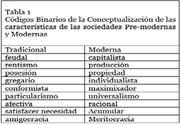 Buena parte de las dificultades con las teorías de la modernización es que, como afirma Alexander, han sido pensadas en un código binario, como dos polos opuestos o de dos lugares extremos de un camino que van desde lo feudal a lo capitalista o desde lo tradicional hasta lo moderno. En la tabla 1 he colocado una lista de esas categorías binarias que se encuentran en la literatura. Unas son amplias y se refieren a largos periodos históricos, otras son más reducidas en su campo analítico.