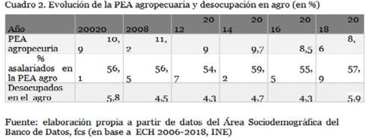 Como se aprecia, el peso de la PEA agraria tiende a decrecer en el período: en el año 2006 representa el 10.9% de la PEA mientras que en el año 2018 es el 8.6%. Este proceso de reducción del peso del empleo agrario en el país, es de larga data, pero se profundiza en esta década, al igual que en otros países de la región en esta fase de crecimiento agrario (Villulla, 2019).