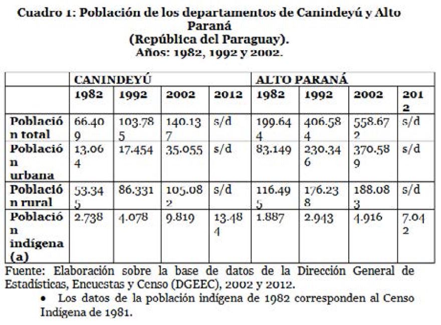 En materia demográfica, la población estimada para 2002 en Alto Paraná rondaba los 559.000 habitantes y en Canindeyú era de unos 140.000 (de las cuales un 34% y 75% era rural respectivamente). En 2002, en cuanto a la población identificada como indígena, en Alto Para- ná estos rondaban el 0,9% y en Canindeyú un 7% (Cuadro 1). Fundamentalmente, se trata de comunidades ava guaraní y mbya, encontrándose además grupos aché en ambos departamentos. Vale destacar la presencia de una comunidad maká en Alto Paraná y de núcleos taí tavyterã en Canindeyú (DGEEC, 2012).