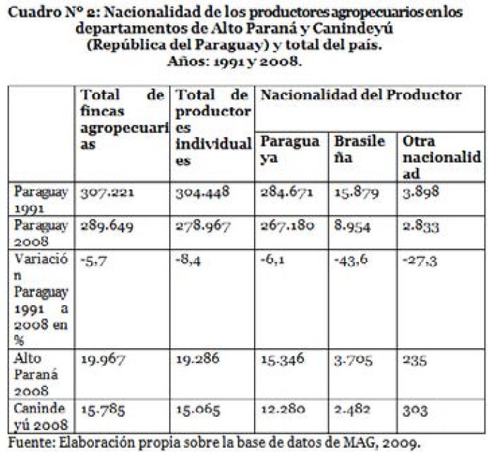 De todas maneras, el proceso de concentración ha afectado a buena directamente a los colo- nos brasileños y otros extranjeros, dado que estos son los que manifiestan una mayor índice de salida de la actividad. Los productores de nacionalidad brasileña decrecen –entre 1991 y 2008- un 44 % y el resto de los extranjeros un 27%, mientras que la disminución de los productores paraguayos sólo decrece un 6% (Cuadro 2).