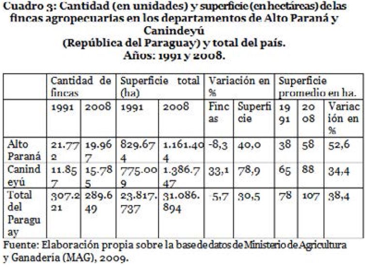 Si se analizan los guarismos de los Censos 1991 y 2008, puede verse un proceso de incre- mento de la superficie promedio de fincas del 53 % en Alto Paraná, 34% en Canindeyú y del 38% en el conjunto del país. Es de resaltar que este proceso se produce en paralelo con a una creciente expansión de la superficie agraria con concentración de la propiedad y disminución del número de fincas del orden 6% en el total de Paraguay. Sin embargo, esta tendencia se manifiesta de forma diferente en los dos departamentos analizados: mientras en Alto Paraná el decrecimiento fue mayor al del conjunto del país (8 %), en Canindeyú el número de fincas crece en un 33% (Cuadro 3).