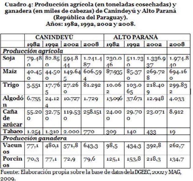 Al iniciarse el siglo XXI, la expansión sojera fue acompañada de la introducción de semi- llas transgénicas provenientes de Brasil y Argentina. Los territorios donde la soja alcanzó una mayor extensión son Alto Paraná, Itapuá, Canindeyú y Caaguazú (Palau et. al., 2009). En los últimos años, Paraguay se convirtió en el sexto productor mundial de soja (por detrás de Estados Unidos, Brasil, Argentina, China e India), séptimo en cuanto a la expansión de cultivos transgénicos (luego de Estados Unidos, Brasil, Argentina, Canadá, India y China) y el cuarto exportador de soja (siguiendo a Estados Unidos, Brasil y Argentina) (James, 2012).