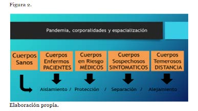 Si intentáramos una clasificación, aunque sea parcial, de las corporalidades actualizadas por la pandemia, encontraríamos tipos como los que indicamos en la figura 2. Como se ve, frente a la noción de cuerpos sanos, entendida como aquellos que no han sido afectados por el virus, podemos señalar cuatro tipos que hemos denominado cuerpos enfermos, cuerpos en riesgo, cuerpos sospechosos y cuerpos temerosos. El primero se refiere a aquellos cuerpos que han sido contagiados y en consecuencia son “pacientes” y su relación espacial apunta hacia el aislamiento, a fin de evitar nuevos contagios. Los cuerpos en riesgo⁹ intenso serían los del personal sanitario (médicos, enfermeras, trabajadores de hospitales, etc.), y la acción corporal que les atañe es la protección, pues son indispensables para combatir la pandemia y no contagiar a quienes vienen a la consulta clínica. Los cuerpos sospechosos son aquellos que presentan algún síntoma (tos, fiebre, etc.) y espacialmente son afectados por procesos de separación física y social, a fin de determinar si el contagio existe o no. Finalmente, los cuerpos temerosos son los de aquellos que recelan del otro visto como fuente de posibles contagios y, en consecuencia, traducen sus prácticas espaciales en un cuidadoso alejamiento de los otros (cambian de acerca en la calle, se esfuerzan por mantener los dos metros de distancia, etc.).