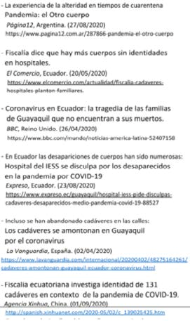 La pérdida de identidad ha producido en la pandemia situaciones extremas, como la ocurrida el 13 de septiembre 2020 en Mendoza, Argentina, con la señora Doris Garro, “Una mujer que, según los médicos, había fallecido por Covid-19, fue enterrada por su familia, pero en realidad todo fue una equivocación: estaba viva en una clínica. Todavía se desconoce a quién ledieron sepultura.” (La Nación, 09/13/2020. https://www.lanacion.com.ar/sociedad/corona-virus-mendoza-enterraron-abuela-despues-se-enteraron-nid2448271).