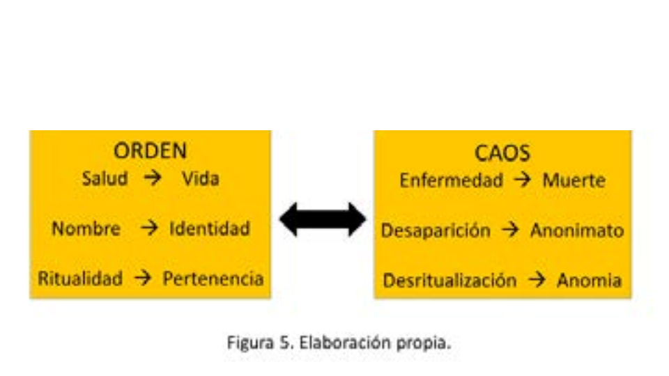 En la pandemia los procesos de desritualización, pérdida de identidad y resemantización de las articulaciones espaciales expresadas en el acercamiento / alejamiento, entre proximidad / distancia, pueden asociarse a un tránsito entre orden y caos.
