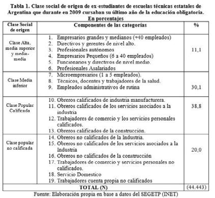 Las teorías sobre las clases sociales acuerdan que el principal indicador para medir la variable es la inserción objetiva en la estructura social dada por la ocupación. En este artículo, se operacionalizó tomando dos dimensiones del Clasificador Nacional de Ocupaciones (CNO) del INDEC, el cual retoma el operativo en cuestión del INET: carácter ocupacional y calificación de la tarea. Se incorporaron además la categoría ocupacional y el tamaño del establecimiento siguiendo el esquema de Dalle (2012) el cual consiste en una adaptación a la estructura ocupacional actual de Argentina del esquema utilizado por Germani (1963).