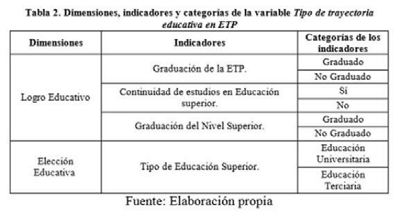 De esta manera, incluimos una serie de indicadores para la construcción de nuestra tipología, cuya selección se basó en el recorrido bibliográfico sobre la educación superior en general y sobre la performance de los egresados de ETP en dicho nivel, junto con el análisis preliminar de los datos. Partimos de definir que la desigualdad en el campo de la educación superior no se da solamente en términos de acceso y graduación, sino también en lo relativo a la elección del “tipo” de educación superior (Terciaria o Universitaria). Bajo este marco, en la Tabla 1 explicitamos nuestra operacionalización del concepto trayectoria educativa de ex-estudiantes de ETP, mostrando las dimensiones elegidas, los indicadores de cada dimensión y sus categorías. La primera dimensión hace referencia al logro educativo de los ex-estudiantes de ETP en Argentina, tomando en consideración su graduación de la ETP, su acceso al nivel superior y la graduación de tal. La segunda dimensión alude a las características de la elección educativa en lo que respecta al tipo de educación superior elegida.