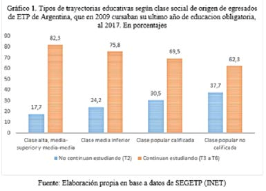 Bajo este recorrido, este escrito busca introducirnos en el mundo educativo posterior a la ETP, considerando su especificidad, mediante la articulación y puesta en juego del concepto teórico-metodológico de trayectorias educativas y un análisis desde la óptica teórica las clases sociales. Así buscamos indagar si hay diferencias entre clases sociales en lo que remite a la graduación de la ETP en sí misma, la continuidad a estudios del nivel superior, en particular si son terciarios o universitarios y la afinidad en la orientación entre sus estudios secundarios y superiores.