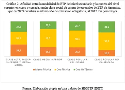 Específicamente, advertimos una ventaja de los estudiantes de clases altas en lo que respecta a la graduación de la educación obligatoria. En suma, en cuanto a los logros educativos (accesos y graduaciones) al nivel superior, notamos una clara ventaja por parte de las clases altas y medias. Por su parte, las clases populares logran acceder a los niveles superiores de manera considerable, aunque en menor proporción. Sin embargo, “no todos los que entran” han logrado salir al 2017, repitiendo así, de manera acentuada, el modelo de inclusión excluyente que se da en el nivel secundario. En este sentido, pareciera que el propósito de la ETP de preparar a los jóvenes para carreras del nivel superior no ha conseguido igualar a los jóvenes una vez egresados de esta modalidad de educación secundaria, pues las desigualdades de origen marcan sus efectos y persisten al cabo de 8 años de haber transitado este tipo de escuelas.