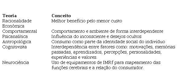 O quadro 1 apresenta uma síntese das principais teorias do comportamento do consumidor em sua ordem evolutiva.