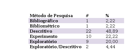 A principal metodologia utilizada nos estudos analisados foi a descritiva (48,89%), seguido dos experimentos (22,22%), conforme descreve a tabela 1: