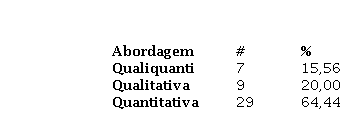 A abordagem predominante foi a quantitativa (64,44%), como exibido na tabela 2.
