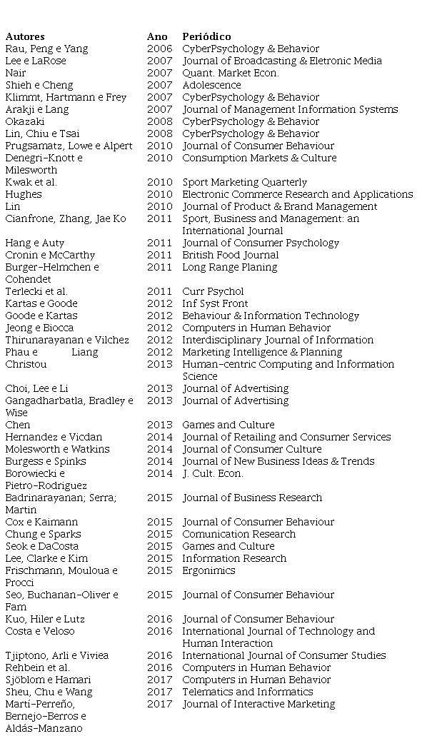 A primeira variável avaliada foi a distribuição dos 45 estudos pelos periódicos. Observou-se uma grande dispersão dos artigos em 36 periódicos, sendo que os que mais apresentaram artigos foram: CyberPsychology & Behavior (4) e Journal of Consumer Behaviour (4), Computers in Human Behavior (2), Games and Culture (2) e Journal of Advertising (2).