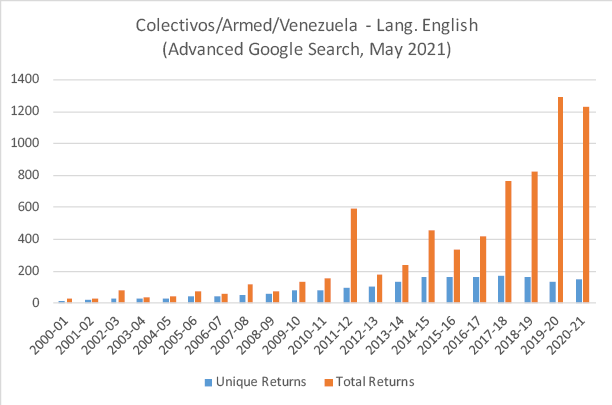 An advanced Google search of the terms “colectivo,” “armed,” and “Venezuela” between January 2000 and January 2021, limited to English language hits, for example, offers an intriguing window into this process. To be sure, this is an imperfect metric –pages disappear over time, indexing , returns can change depending on distinct user preferences, and as returns become more plentiful it is difficult to review each result for relevance or duplication.1 However, it provides a baseline approach into the term’s usage over time from which we can glean illuminating patterns about how colectivo has come to occupy the diffuse and contested discursive space it currently holds.