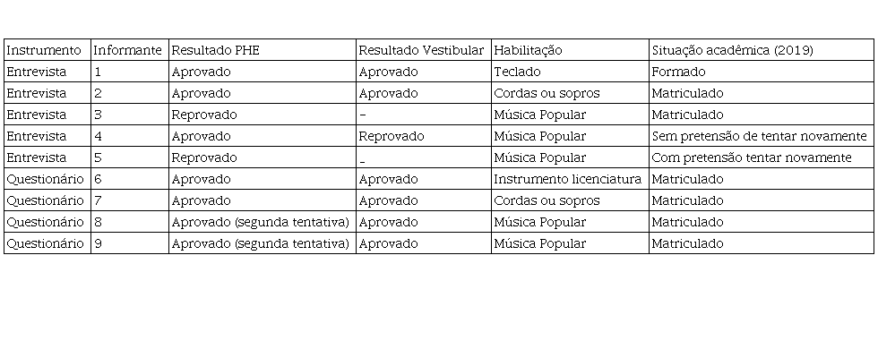 As entrevistas foram realizadas com seis sujeitos que se inscreveram na chamada Prova de Habilidades Específicas (PHE) ou Teste Específico (TE) de 2014 e de 2017, sendo três aprovados e três reprovados no teste. Os estudantes foram escolhidos aleatoriamente, por sorteio, por meio das listas de inscritos nas Provas disponíveis no sítio eletrônico da UFRGS. Na época da pesquisa constavam na página da UFRGS os resultados das seleções realizadas nos anos 2014, 2017 e 2018. Com o objetivo de entrevistar sujeitos que vivenciaram o curso por mais tempo foram selecionados alunos aprovados e reprovados na PHE dos anos de 2014 e de 2017. O contato com os informantes se deu através das redes sociais, onde seis estudantes mostraram interesse na conversa presencial. As entrevistas ocorreram entre os meses de agosto e outubro de 2019. A aplicação do questionário permitiu que mais estudantes relatassem suas vivências na graduação. Por intermédio dele foram obtidos quinze relatos que apontavam dificuldades diversas no cotidiano do curso. O formulário eletrônico foi enviado por e-mail em setembro de 2019 a todos os estudantes matriculados no curso de Música, ficando aberto até novembro do mesmo ano. O Quadro 1 apresenta os estudantes por trás dos relatos citados no presente artigo, o instrumento por meio do qual se deu sua participação na pesquisa e o número por meio do qual estes são representados no trabalho.