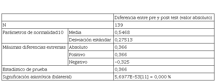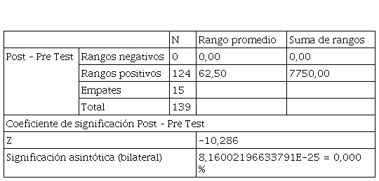 El nivel de significación asintótica bilateral (5,6977E-53 = 0,000%) resultó por debajo del p valor al 5% (0,05), por esta razón la forma de distribución de la variable medida (diferencia absoluta entre el pre y el post test) es muy distinta a la distribución normal, es decir, que la data obtenida no comporta normalidad. En la Tabla 8 se muestran los estadísticos respectivos a la prueba aplicada. Debido a la situación de no normalidad en la distribución de la data, pues no resulta posible utilizar procedimientos estadísticos de tipo paramétricos, además de que el nivel de medición de la variable respuesta es de tipo ordinal en este caso, tal como se señaló en el diseño metodológico. En vista de la situación, se empleó una técnica estadística no paramétrica equivalente, ya ajustada a variables en medición ordinal y en condiciones de no normalidad de los datos (Rangos de Wilcoxon [W+]).