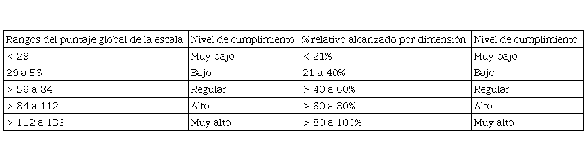 El instrumento principal de la investigación se constituyó en un checklist o lista de verificación actualizado en torno a las BPA del MFD de Rancho Viejo. Este instrumento se diseñó específicamente para este caso de estudio, ya siguiendo las características concretas, condiciones físico-ambientales y de funcionamiento del módulo; así como en los objetivos y las áreas de formación del programa educativo ambiental. El tiempo intermedio esperado entre las fases pre y post test fue de seis (06) meses, tomando al mes de mayo de 2021 como punto de partida para la realización del pre test y, el mes de noviembre de ese año para la aplicación del post test. El grado de satisfacción de los requisitos del checklist se ajustó a tres niveles ordinales que van de 0 a 1 (no cumple [0], cumple a medias [0,5], sí cumple [1]). La escala global del instrumento obtuvo una excelente consistencia interna (α = 0,94; p < 0,05) y su validez de contenido fue avalada mediante juicio de expertos en materia ambiental, informática y geográfica. En ese sentido, el instrumento quedó conformado por trece (13) dimensiones, tres (03) subdimensiones y 139 indicadores. Para el cálculo del puntaje global y la calificación de los índices de cada dimensión de las variables se utilizó una escala de Likert de cinco niveles ordinales. Los resultados se distribuyeron, en primer lugar, según el rango del valor absoluto sobre el puntaje total arrojado y, en segundo lugar, de acuerdo con el porcentaje relativo alcanzado en cada dimensión, tal como se muestra en la Tabla 2.